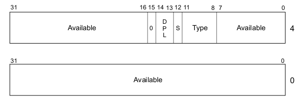 用于指示该段是否在存在于内存当中。若P位为0,操作系统可将使用下图中标识为Available的位置,比如用来存放加载该段所需的信息。