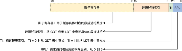 上图中影子寄存器是靠硬件来操作的,对系统程序员不可见,是硬件为了减少性能损耗而设计的一个段描述符的高速缓存,不然每次内存访问都要去内存中查表,那性能损失是巨大的,影子寄存器也正好是 64 位,里面存放了 8 字节段描述符数据。