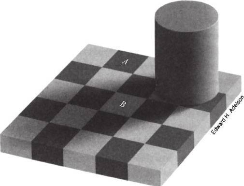 这幅图会给人以错觉,方块A的颜色看起来比方块B要深一些。之所以称之为错觉,是因为方块A和方块B的灰度是完全相同的。你可能不相信,就连我们有时也觉得需要再去仔细查一下两个方块的颜色,因为方块A和方块B看起来真的不一样。如果你不想轻信我们的这个说法,就请拿出一张纸,盖在图上剪两个洞——只露出方块A和方块B。这样你就能看到,这两个方块的颜色完全一致。那么,我们的双眼为什么会遭遇如此的误导?