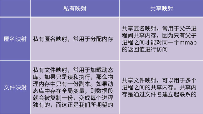 mmap 这个系统调用的能力非常强大,先来了解一下它最常见的用法。根据映射的类型,mmap 有四种最常用的组合: