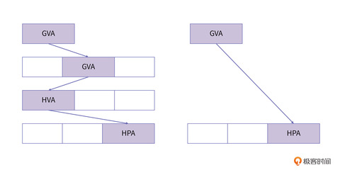 可以看到,影子页表将原来的三级映射压缩成了一级映射,CR3 寄存器里只要存储影子页表的地址就可以了。这样 MMU 就可以自动完成从 GVA 到 HPA 的转换。