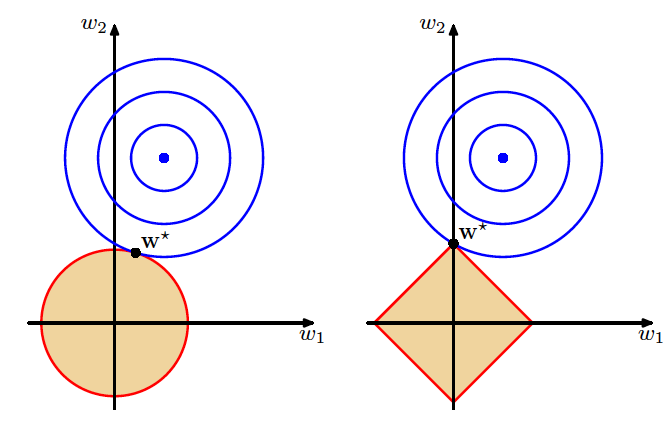 红色边界表示的则是正则化项对参数可能取值的约束,这里假定了未知参数的数目是两个。岭回归中要求两个参数的平方和小于某个固定的取值,即 \(w_1^2 + w_2^2 < t\)。因此解空间就是浅色区域代表的圆形;而 LASSO 要求两个参数的绝对值之和小于某个固定的取值,即 ∣w1∣+∣w2∣<t,因此解空间就是浅色区域代表的方形。