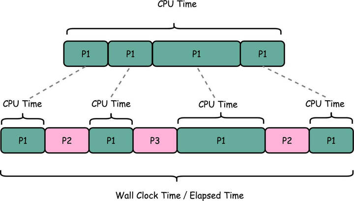 在我给的这个例子里,你可以看到,实际上程序用了 0.101s,但是 CPU time 只有 0.031+0.016 = 0.047s。运行程序的时间里,只有不到一半是实际花在这个程序上的。