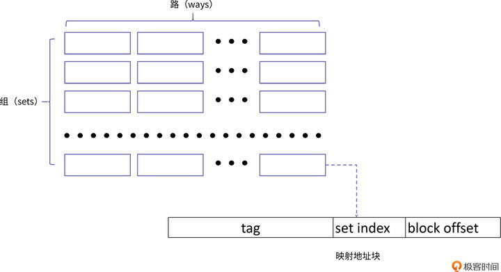缓存块的组织形式 July 14, 2022 缓存块的组织形式 # 我们先从如何管理缓存块的角度,来看下缓存块的组织形式: 上图中的小方框就代表一个缓存块。从图中,你也可以看到,整个缓存由组(set)构成,每个组由路(way)构成。所以整个缓存容量等于组数、路数和缓存块大小的乘积: 整个缓存容量=组数×路数×缓存块大小 为了简化寻址方式,内存地址确定的数据块总是会被放在一个固定的组,但可以放在组内的任意路上,也就是说,对于一个特定地址数据的访问,它如果要载入缓存,那么它放在上图中的行数是固定的,但是具体放到哪一列是不固定的。 Viewpoint # From # 14 | CPU Cache:访存速度是如何大幅提升的? Links #