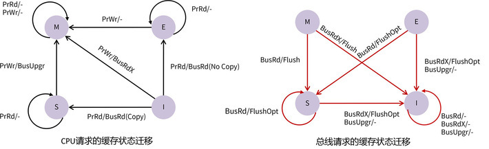- E 状态:当侦听到 BusRd 请求时,说明另一个处理器遇到了缓存缺失,并试图获取该缓存块,因为最终的结果是要将这个缓存块,放在不止一个处理器缓存上,所以状态必须被置为 S。这样就会产生 FlushOpt 事件,来完成缓存到缓存的传输。当 BusRdX 被侦听到时,说明有其他处理器想要独占这个缓存块上的数据,这种情况下,本地缓存块将会被清空并且状态需要置为 I,同时也会产生 FlushOpt 事件,完成缓存到缓存的传输,将当前数据的最新值同步给需要进行写操作的其他处理器。而当侦听到 BusUpgr 时,说明其他处理器要写当前处理器持有的缓存副本,所以要将状态置为 I,但是不必产生总线事务;