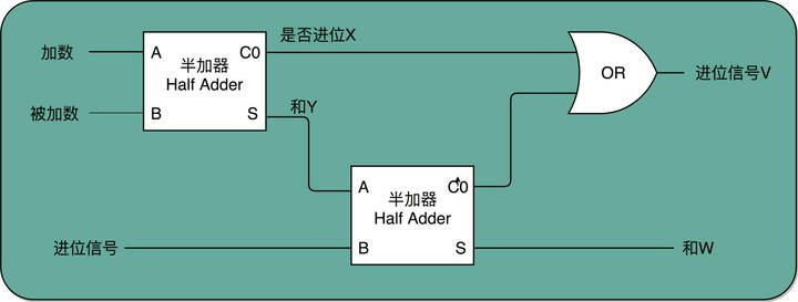 这样,通过两个半加器和一个或门,我们就得到了一个,能够接受进位信号、加数和被加数,这样三个数组成的加法。这就是我们需要的全加器。