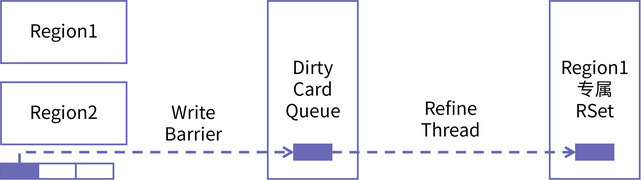在 G1 中,我们把这种 card 称为 dirty card。和 SATB 相似,业务线程也不是直接将 dirty card 放到 RSet 中的。而是在业务线程中引入一个叫做 dirty card queue(DCQ)的队列,在写屏障中,业务线程只需要将 dirty card 放入 DCQ 中,而不做非常细致的检查。