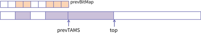 我们再从对象活跃性的角度理解两个 TAMS 指针和 top 的关系。当并发标记开始时,nextTAMS 就固定了,但是 top 还是可能继续向后移,所以 nextTAMS 和 top 之间的对象在这次标记过程中都被认为是活跃对象。当 Evacuation 开始时,它只使用 prevBitMap 的信息,显然 prevBitMap 中的信息只能覆盖到 prevTAMS 处,所以从 prevTAMS 到 top 的对象就都认为是活跃的。
