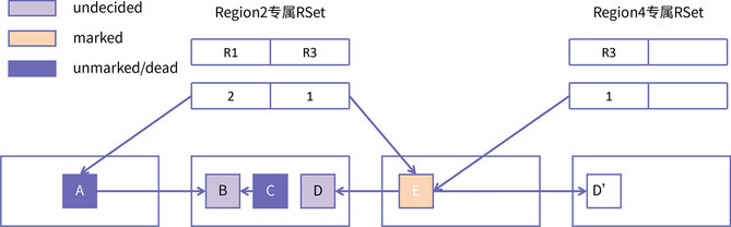 Region1 中的 A 是垃圾对象,这在并发标记阶段就已经发现了,所以在转移阶段就不会再起作用了。进而,Region2 中的 B、C 也不会被标记到,最终只有对象 D 被拷贝到了 Region4,与此同时,原始 Region2 的 RSet 也会被维护到 Region4。