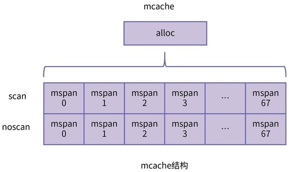 mcache 是 Go 的线程缓存,对应于 TCMalloc 中的 Thread cache 结构。 mcache 会与线程绑定,每个 goroutine 在向 mcache 申请内存时,都不会与其他 goroutine 发生竞争。mcache 中会维护上述 68×2 种 spanClass 的 mspan 数组,存放在 mcache 的 alloc 中,包括 scan 以及 noscan 两个队列。 mcache 的主要结构如下: