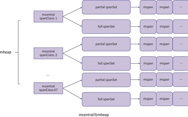 mcentral 中也存有 spanClass 的 ID 标识符,这表示说每个 mcentral 维护着固定一种 spanClass 的 mspan。 spanClass 下面是两个 spanSet,它们是 mcentral 维护的 mspan 集合。 partial 里存放的是包含着空闲空间的 mspan 集合,full 里存放的是不包含空闲空间的 span 集合。这里每种集合都存放两个元素,用来区分集合中 mspan 是否被清理过。
