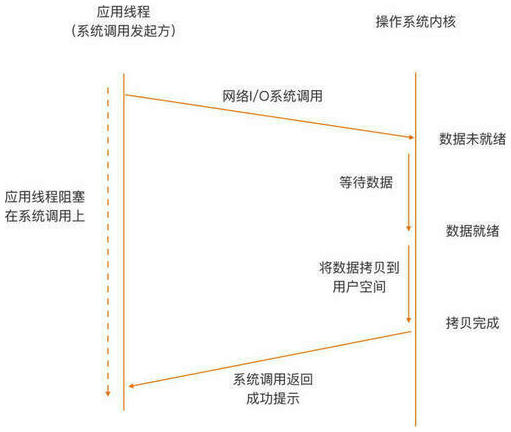 阻塞 I/O 是最常用的模型,这个模型下应用线程与内核之间的交互行为模式是这样的: