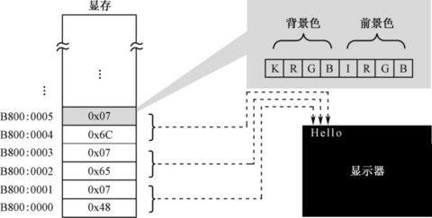 字符的显示属性(1 字节)分为两部分,低4 位定义的是前景色,高4 位定义的是背景色。色彩主要由R、G、B 这3 位决定,可以由红(R)、绿(G)、蓝(B)三原色来配出其他所有颜色。K 是闪烁位,为0 时不闪烁,为1 时闪烁;I 是亮度位,为0时正常亮度,为1 时呈高亮。