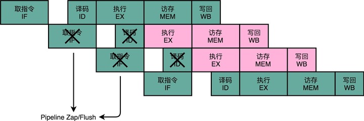 如果分支预测是正确的,我们自然赚到了。这个意味着,我们节省下来本来需要停顿下来等待的时间。如果分支预测失败了呢?那我们就把后面已经取出指令已经执行的部分,给丢弃掉。这个丢弃的操作,在流水线里面,叫作 Zap 或者 Flush。