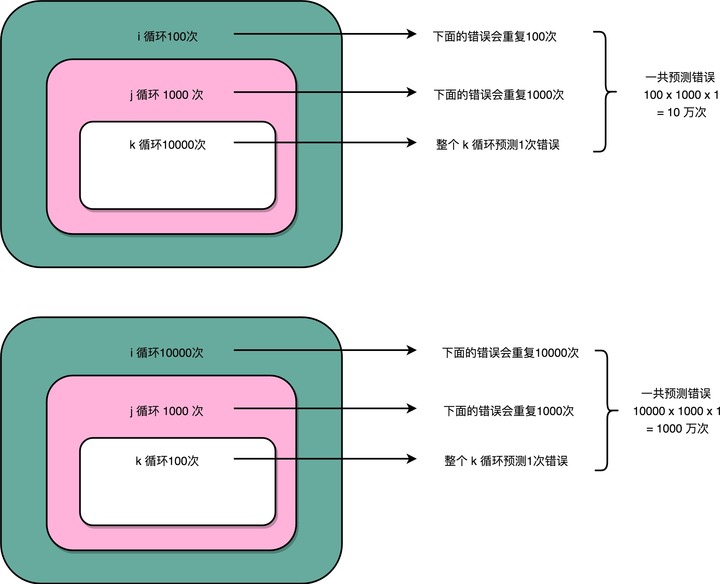 上面的第二段循环,也就是内存 k 的循环 100 次的代码,则是每 100 次循环,就会发生一次预测错误。这样的错误,在第二层 j 的循环发生的次数,还是 1000 次。最外层 i 的循环是 10000 次,所以一共会发生 1000 × 10000 = 1000 万次预测错误。