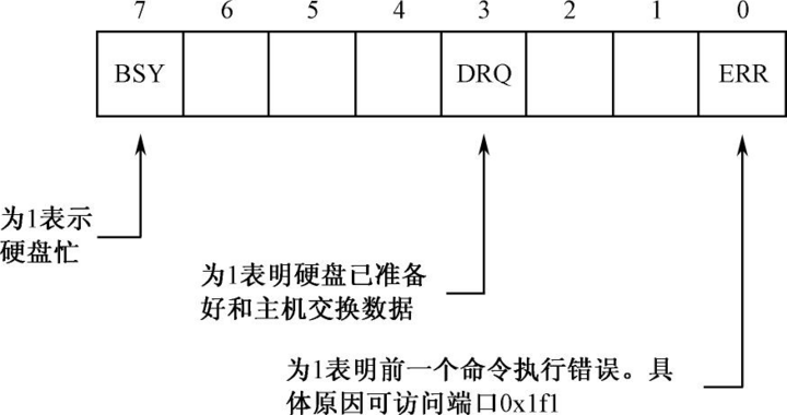 0x1f7端口即是命令端口,也是状态端口。向这个端口发送读写命令之后,硬盘就会把0x1f7端口的第7位设为1,表示自己很忙。一旦数据准备完成,第7位会被重新置0,同时,第3位会被置1,表示数据准备好了。