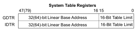 GDTR格式 September 16, 2022 Content # Global Descriptor Table Register 用于定位 Global Descriptor Table. GDTR中的内容含义如下: base address在保护模式下是32位,长模式下是64位。 GDTR.base提供GDT的基地址,GDTR.limit提供GDT的表限。 Links #