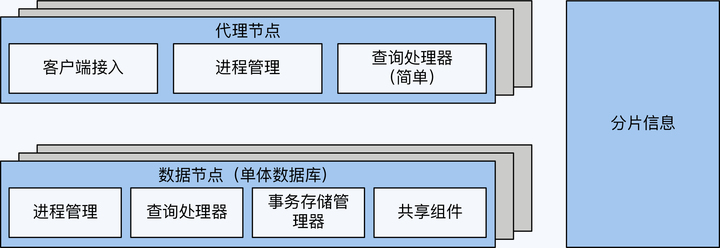 代理节点需要实现三个主要功能,它们分别是客户端接入、简单的查询处理器和进程管理中的访问控制。
