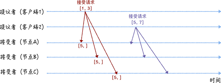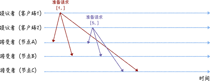 我们假设客户端 1 的提案编号为 1,客户端 2 的提案编号为 5,并假设节点 A、 B 先收到来自客户端 1 的准备请求,节点 C 先收到来自客户端 2 的准备请求。