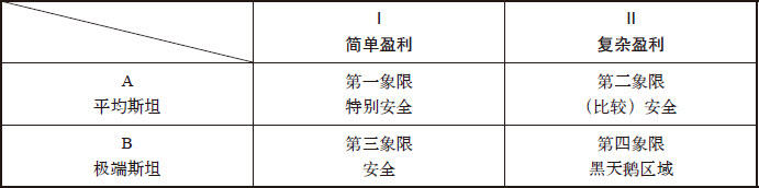 第一象限。平均斯坦中简单的二元盈利:预测是安全的,生活是轻松的,人人应当快乐。然而遗憾的是,这些情况更多地出现在实验室和游戏中,而不是真实的生活中。在作出经济决定盈利时,我们极少遵循这些。比如,一些医疗决定(关于单个病人,而不是全部病人)、赌场赌注、预测市场等。