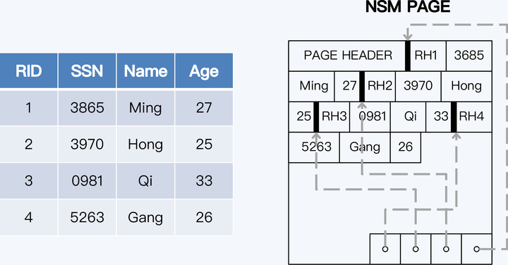 NSM(N-ary Storage Model)就是行式存储,也是 OLTP 数据库默认的存储方式,始终伴随着关系型数据库的发展。我们常用的 OLTP 数据库,比如 MySQL(InnoDB)、PostgreSQL、Oracle 和 SQL Server 等等都使用了行式存储。