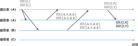 首先节点 A 是领导者,提案编号为 1,提议了指令 X、Y,对应的序号分别为 101 和 102,但是因为网络故障,指令只成功复制到了节点 A。