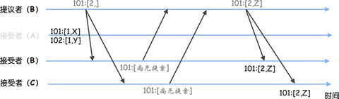 假设这时节点 A 故障了,新当选的领导者为节点 B。节点 B 当选领导者后,需要先作为学习者了解目前已被选定的指令。节点 B 学习之后,发现当前被选定指令的最大序号为 100(因为节点 A 故障了,它被选定指令的最大序号 102,无法被节点 B 发现),那么它可以从序号 101 开始提议新的指令。这时它接收到客户端请求,并提议了指令 Z,指令 Z 被成功复制到节点 B、C。