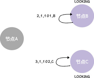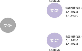 接着节点 B、C 分别接收到来自对方的选票,比如 B 接收到来自 C 的选票,C 接收到来自 B 的选票: