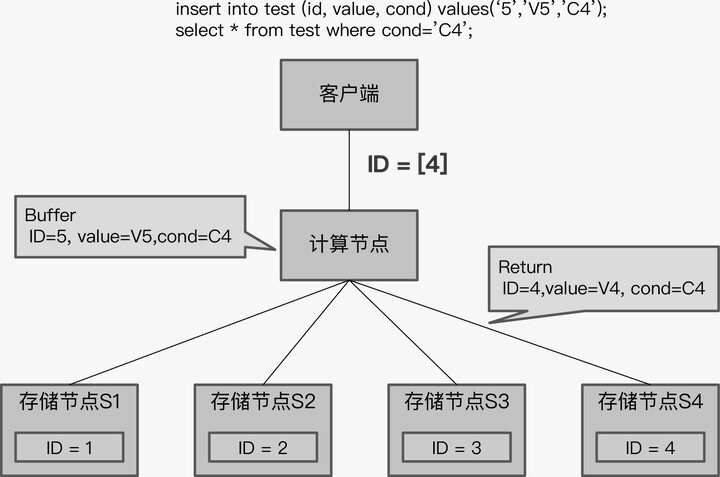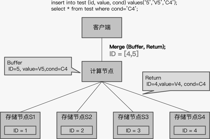 TiDB 采用了“缓存写提交”技术,就是将所有的写 SQL 缓存起来,直到事务 commit 时,再一起发送给存储节点。这意味着执行事务中的 select 语句时, insert 的数据还没有写入存储节点,而是缓存在计算节点上的,那么 select 语句下推后,查询结果将只有 ID 为 4 的记录,没有 ID 等于 5 的记录。