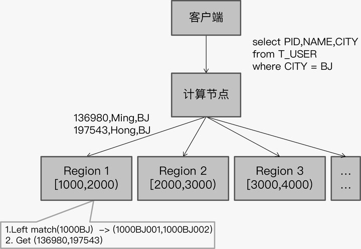 - 存储节点在每个 Region 上执行下推计算,取 Region 的起始值加上查询条件中的索引值,拼接在一起作为左前缀,扫描索引数据行。