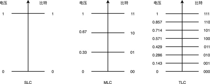 但是,这样的方式会遇到和 CPU Cache 类似的问题,那就是,同样的面积下,能够存放下的元器件是有限的。如果只用 SLC,我们就会遇到,存储容量上不去,并且价格下不来的问题。于是呢,硬件工程师们就陆续发明了 MLC(Multi-Level Cell)、TLC(Triple-Level Cell)以及 QLC(Quad-Level Cell),也就是能在一个电容里面存下 2 个、3 个乃至 4 个比特。