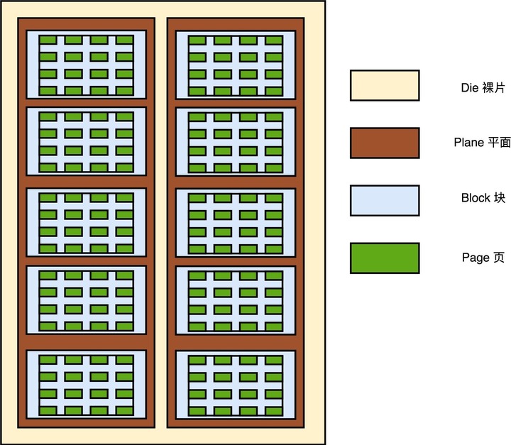 接下来,一张裸片上可以放多个平面(Plane),一般一个平面上的存储容量大概在 GB 级别。一个平面上面,会划分成很多个块(Block),一般一个块(Block)的存储大小, 通常几百 KB 到几 MB 大小。一个块里面,还会区分很多个页(Page),就和我们内存里面的页一样,一个页的大小通常是 4KB。