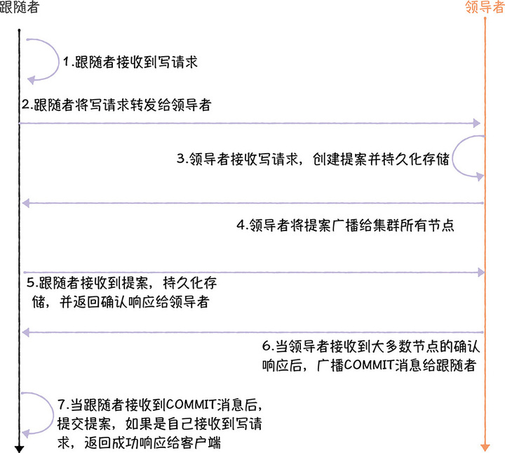 写操作的流程 November 19, 2022 Content # 在 ZooKeeper 代码中,处理写请求的核心流程就像下图一样(跟随者接收到写请求的情况)。 Viewpoints # From # 加餐 | ZAB协议(三):如何处理读写请求? Links #