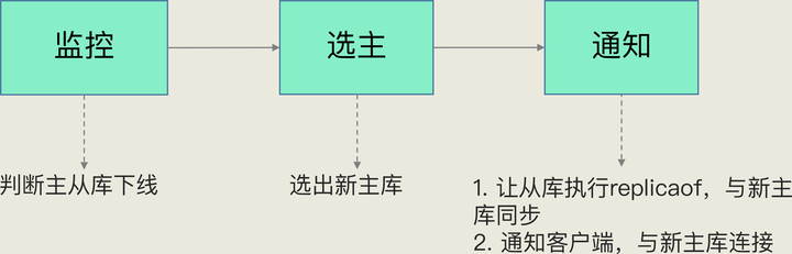在执行通知任务时,哨兵会把新主库的连接信息发给其他从库,让它们执行 replicaof 命令,和新主库建立连接,并进行数据复制。同时,哨兵会把新主库的连接信息通知给客户端,让它们把请求操作发到新主库上。