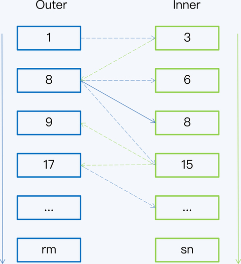 - 第二阶段就是归并,因为两张表已经按照同样的顺序排列,所以 Outer 表和 Inner 表各一次循环遍历就能完成比对工作了。