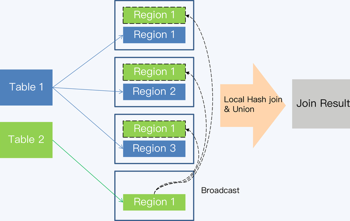 大小表关联时,可以把小表复制到相关存储节点,这样全局关联就被转换为一系列的本地关联,再汇总起来就得到了最终结果。这种算法的具体实现方式有两种。