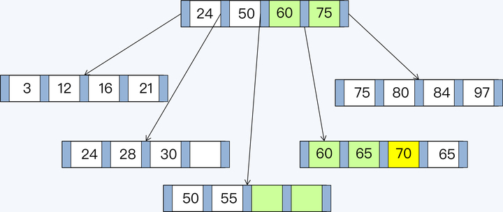 B+Tree 由内节点(InterNode)和叶节点(LeafNode)两类节点构成,前者仅包含索引信息,后者则携带了指向数据的指针。当插入一个索引值为 70 的记录,由于对应页表的记录已满,需要对 B+Tree 重新排列,变更其父节点所在页表的记录,并调整相邻页表的记录。完成重新分布后的效果如下: