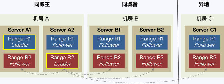 比较典型的分布式数据库部署模式是两地三中心五副本。这种模式下,每个分片都有 5 个副本,在同城的双机房各部署两个副本,异地机房部署一个副本。