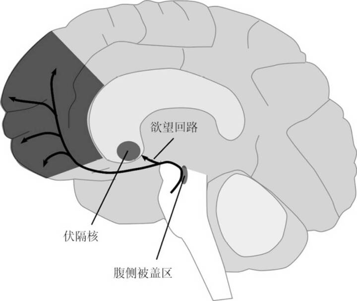 欲望始于大脑中一个在进化上早就存在的区域,位于头骨深处,被称为腹侧被盖区。这一区域富含多巴胺,事实上,它是多巴胺两个主要的产生区域之一。像大多数脑细胞一样,生长在那里的细胞长着长长的尾巴,穿过大脑到达伏隔核。这些长尾巴的细胞被激活时,会将多巴胺释放到伏隔核中,让我们产生做某事的动力。这个回路叫作中脑边缘通路,但我们通常更直白地称之为“多巴胺欲望回路”。