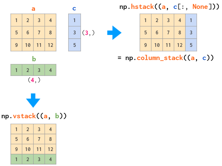 堆叠函数(vstack,hstack)用于一维数组 February 27, 2023 Content # Numpy中堆叠函数主要有两个:vstack, hstack。当涉及一维数组与矩阵之间的混合堆叠时,两个函数的表现会有何区别?为什么? 当涉及一维数组与矩阵之间的混合堆叠时,vstack可以正常工作:hstack会出现尺寸不匹配错误。因为,一维数组被解释为行向量,而不是列向量。解决方法是将其转换为列向量,或者使用column_stack自动执行。 From # Links #