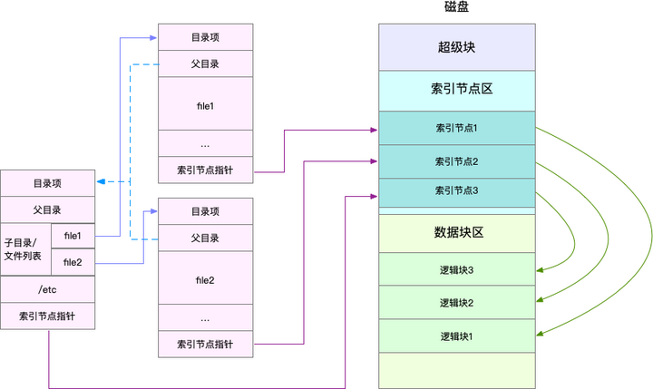 换句话说,索引节点是每个文件的唯一标志,而目录项维护的正是文件系统的树状结构。目录项和索引节点的关系是多对一,比如,通过硬链接为文件创建的别名,就会对应不同的目录项,不过这些目录项本质上还是链接同一个文件,所以,它们的索引节点相同。