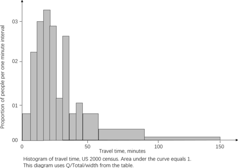 对直方图来说,它的柱子宽度代表区间的长度,根据区间的不同,柱子宽度可以不同。但柱状图的柱子宽度没有数值含义,所以宽度必须一致。你可以看看下面的这张图,这是美国人口普查局(The U.S. Census Bureau)调查 12.4 亿人的上班通勤时间的直方图,最后右侧的直方柱子就像一个矮胖子一样,直接蹲在地板上了。