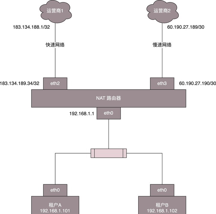 例如,运营商 1 给路由器分配的地址是 183.134.189.34/32,而运营商网络里面的网关是 183.134.188.1/32。有的是 /30 的,也就是分了一个特别小的网段。运营商 2 给路由器分配的地址是 60.190.27.190/30,运营商网络里面的网关是 60.190.27.189/30。