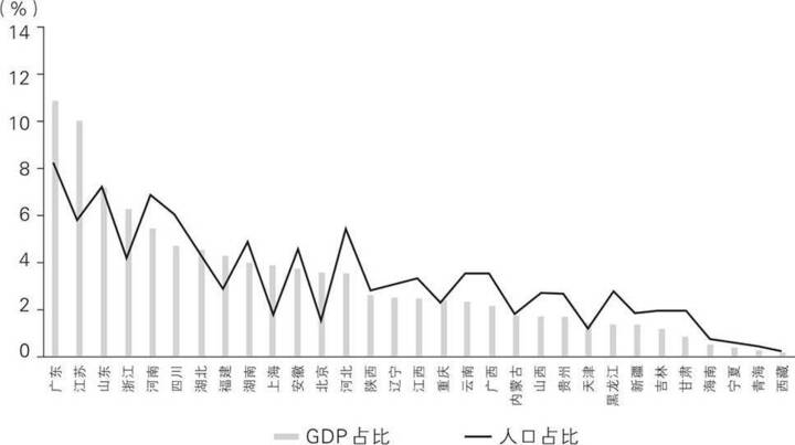 图(b) 2019年中国各省份占全国GDP和人口的比重