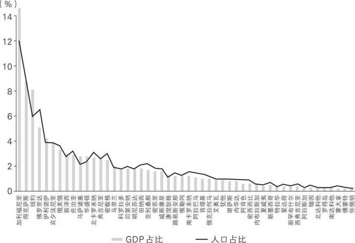 GDP衡量的是经济总量,人口越多的地方GDP自然越大,所以图中折线的高度和柱子高度差不多。假如一个州的GDP占比为3%,人口占比差不多也是3%。换句话说,州与州之间虽然规模差别很大,但人均GDP差别很小,无论生活在哪个州,平均生活水平都差不太多。