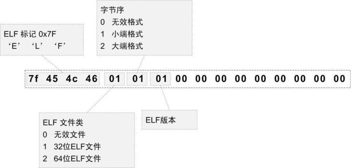 最开始的4个字节是所有ELF文件都必须相同的标识码,分别为0x7F、0x45、0x4c、 0x46,第一个字节对应ASCII字符里面的DEL控制符,后面3个字节刚好是ELF这3 个字母的ASCII码。这4个字节又被称为ELF文件的魔数,几乎所有的可执行文件格式的最开始的几个字节都是魔数。