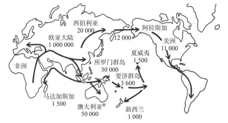 智人征服世界 July 24, 2023 Content # 这张图显示了我们的祖先由非洲散布到世界各地的过程。数字代表距今的年数。未来的考古发现可能会改变某些数字,例如西伯利亚和所罗门群岛,说不定比图中显示的时间更早就有人居住了。 From # 第三种黑猩猩 Links #