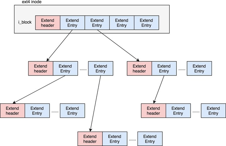 如果文件比较大,4 个 extent 放不下,就要分裂成为一棵树,eh_depth>0 的节点就是索引节点,其中根节点深度最大,在 inode 中。最底层 eh_depth=0 的是叶子节点。