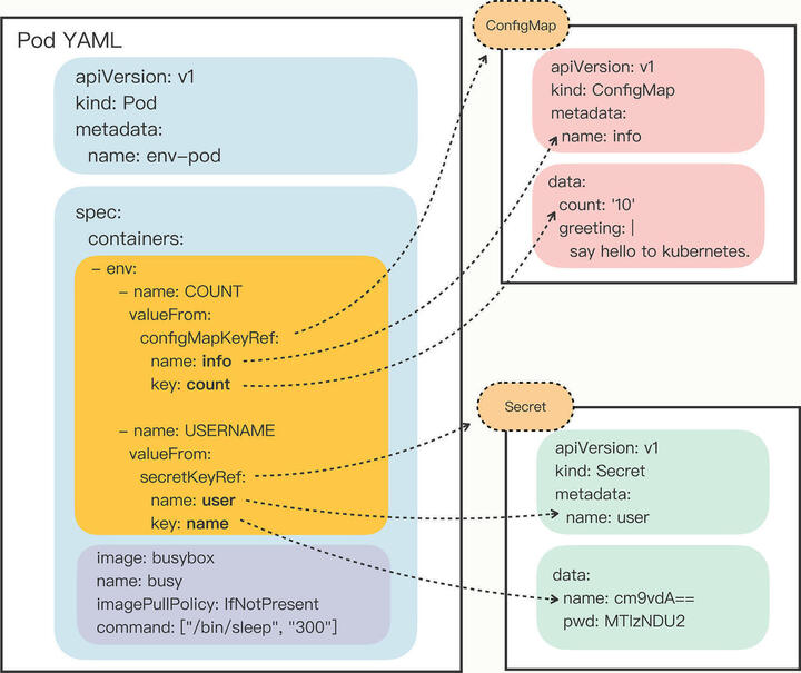 可以使用另一个“valueFrom”字段,从 ConfigMap 或者 Secret 对象里获取值。由于“valueFrom”字段在 YAML 里的嵌套层次比较深,初次使用最好看一下 kubectl explain 对它的说明:
