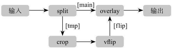 在以上示例中,crop与vflip使用的是同一个滤镜处理的线性链,split滤镜和 overlay滤镜使用的是另外一个线性链,一个线性链与另一个线性链汇合时是通过方括号“[]”括起来的标签进行标示的。在这个例子中,两个流处理后是通过 [main]与[flip]进行关联汇合的。